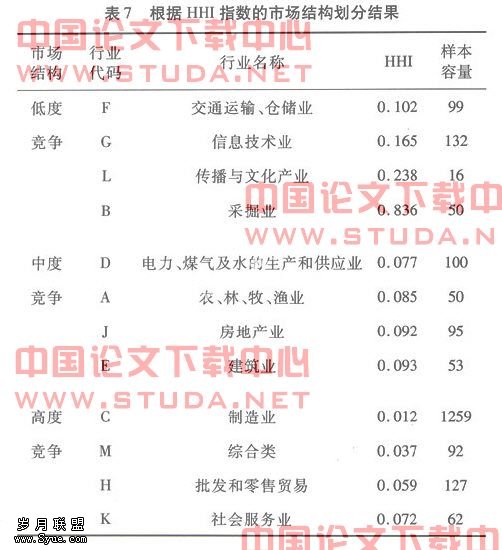 《上市公司行业分类指引》将上市公司划分为13个行业,剔除掉证券类行业后,剩下12个行业。本文通过计算各行业的HHI,以衡量该行业的市场竞争强度。HHI=∑(xi/X)?2,xi为i企业的销售额,用营业收入替代,X=∑xi。根据HHI值大小,将12个行业平均分为三大类——低度竞争行业、中度竞争行业、高度竞争行业(见表7)。