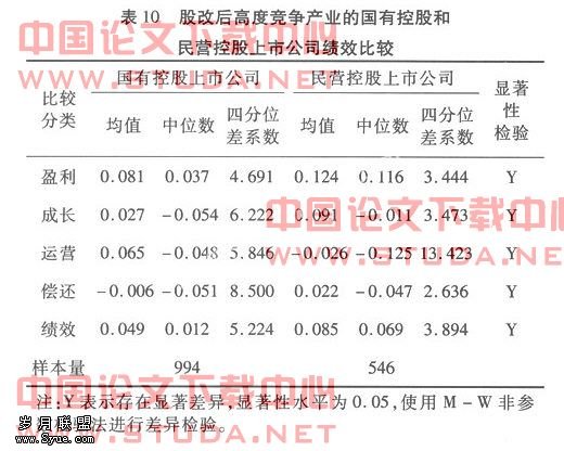 从表9可以看出,在中度竞争行业中,民营控股上市公司的绩效略高于国有控股上市公司,民营控股上市公司的绩效得分均值为0.103,中位数为0.068;国有控股上市公司的绩效得分均值为0.082,中位数为-0.012,但是在0.05的显著水平下,该差异并不显著。具体来说,民营控股上市公司在盈利、运营、成长方面优于国有控股上市公司,但只有运营能力的差异是显著的;在偿还方面前者不如后者,而该差异统计上不显著。