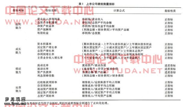 由于单个指标和少数几个指标都难以反映上市公司的整体绩效,因此,为了更加全面衡量公司绩效,本文从体现我国上市公司特点和股东利益诉求出发,在重点考虑盈利能力和成长能力的基础上,同时兼顾了反映企业日常经营水平的运营能力和反映其抗风险水平的偿还能力,以求从多角度对公司绩效进行衡量。本文将公司绩效分为盈利能力、成长能力、偿还能力及运营能力等四个一级指标。在每个一级指标下,又分设了多个二级指标(见表1)。