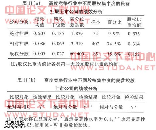 总体来看,在高度竞争行业,不同股权集中度民营上市公司的绩效有明显差异,主要特征是:股权集中度越高,相应公司绩效也越高。