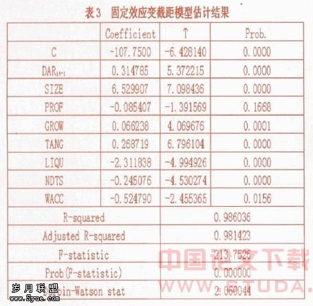 正如预期的一样,资产负债率前期值的系数为正,且在所有自变量中显著性最高,证明了模型中该变量设置的有效性。DARit-1的估计系数γ0为0.3148,说明公司资产负债率的确是随时间逐渐调整至最优状态,资本结构决定过程确实具有动态性。从表3看到,资本结构滞后项DARit-1的系数γ0为正且在1%的显著性水平上显著。同公式(5)可知,公司资本结构调整系数δ=1-γ0,由估计的γ0值计算系数δ为0.6852。与Banerjee, Heshmati 和Wihlborg在2000年对英美两国企业所做研究得到的调整系数估计值比较,我国电力上市公司动态调整其资本结构的程度还是比较高的,说明我国电力上市公司资本结构调整的成本比较低。