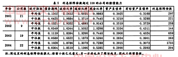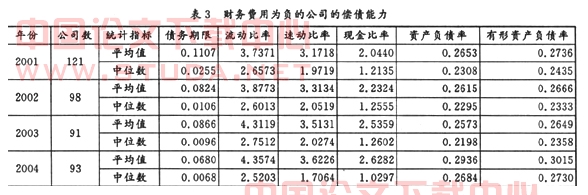 由表3可以看出,财务费用为负的公司的债务期限尤其短,除了2001年的平均值为0.11外,其余年份的平均值均不足0.10;而中位数在2003年和2004年均接近于0。再来看这些公司的短期偿债能力。四年中,流动比率的平均值均在4左右,远远高于经验值2,而中位数也高达2.5以上。速动比率的平均值均在3以上,也远远高于经验值1,而中位数均在2.0左右。现金比率的平均值均在2.0以上,而中位数均在1.0以上。所有这些数据都说明一个共同的问题,即从总体上来看,财务费用为负的公司的短期偿债能力是非常之强的。然而,这些数据,尤其是现金比率数据,也说明这些公司似乎找不到好的投资方向,通过股权融资获得的资金很多都存到银行或用来进行短期投资了。最后再来看这些公司的长期偿债能力指标。在连续四年中,无论是资产负债率还是有形资产负债率,其平均值和中位数均在0.30以下,远低于经验值0.5,这就从另一个角度进一步验证了这些公司的长期偿债能力也是相当强的。