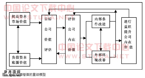上市公司的价值增值除考虑以上影响因素外,还必须要从上市公司的市场价值出发,通过对上市公司经营业绩的分析,衡量其股票的增值动因及其增值幅度,并通过未来时期的自由现金流量贴现的方法来评估其内在价值,然后把公司市场价值与内在价值对比,寻找其提升价值的新途径。在内在价值评估的基础上,分别对公司的内部条件和外部环境两个方面进行公司价值的改进和改善,最后通过财务工程进行公司资产的重组,提升其潜在价值,使公司整体价值达到增值。根据以上分析,可以构建上市公司价值增值的重组模型(见图1),这个模型对我国上市公司增值的影响经过五个步骤,实现三级价值提升。