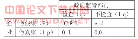 第一个数字表示企业的得益;第二个数字表示政府监管部门的得益。R 表示监管部门查出假账后所得的奖励;L表示政府监管部门的检查成本;R -L 表示政府监管部门查出假账后的净得益;C表示企业做假账被查出后的损失;d表示政府监管部门没有查出假账的损失;e表示企业做假账没被查出所得好处.