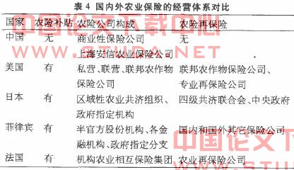 国外农业保险经营除了有政府的经济支持,还有完整的经营体系;而我国农业保险经营缺乏专业保险公司介入,资本结构单一,使得经营策略和具体业务受到局限。农业保险业务再保险更是一片空白,使保险公司的风险得不到有效分散和补偿。在这种不完整的经营体系下农业保险很难有发展的空间。 5.农业保险缺少支持