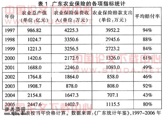 根据统计,广东农业保险的保费收入从1997年的4225.3万元,急剧萎缩到2005年的1402.7万元,减少了2822.6万元;在保费收入急速下降的带动下,赔款支出也急速下降,由1997年的3952.2万元,下降到2005年的1115.5万元,减少了2836.7万元;广东农业保险赔付率一直处于较高水平徘徊,九年的平均赔付率高达70.8%(见表1)。