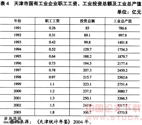 运用表4中1991~2003年天津市国有工业企业劳动工资和资本支出以及工业总产值的数据,可以分别回归出劳动要素和资本要素的贡献率。