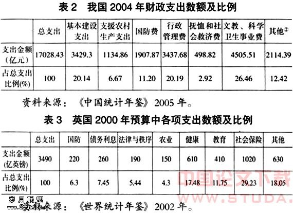 从表2和表3中我们可以看出,我国和英国的财政支出结构有巨大差异。英国财政用于社会保险、健康和的转移性公共支出占到总支出的58.46%;而我国用于文教、卫生和社会福利方面的财政支出仅占总支出的29.38%。这说明,英国的财政支出结构履行着较强的调节收入分配职能。因为政府公共支出中所发生的资金转移主要是在社会成员之间的资源再分配,英国政府的这种公共支出结构既有利于收入分配趋于公平,又有利于保持社会保险体制的财政平衡。