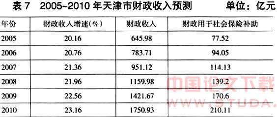 根据上述方程可以出2005~2010年财政收入增长率与GDP增长率比值的变化趋势为:1.68、1.73、1.78、1.83、1.88、1.93。如果2005~2010年天津市GDP保持12%的增长速度(近10年天津市GDP增速的平均值),则可以测算出同期财政收入的年均增长速度,进而可以测算出2005~2010年天津市财政收入的规模。如果保持财政对社会保险补助的增长与GDP增长相同的速度,即每年用财政收入的12%进行社会保险补助,则可最终计算出2005~2010年财政用于社会保险补助的财力(测算结果见表7)。也就是说,天津市财政用于支持社会保险的财力可以保持18%的年均增长速度。