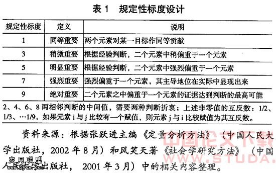 层次分析法是20世纪70年代中期由美国著名运筹学家萨蒂(Saaty)提出的。这是一种依据序标度,将系统因素按支配关系分组以形成有序的递阶层次结构,通过两两比较判断方式以确定每一层次中因素的相对重要性;然后在递阶层次结构内进行合成,以得到决策因素相对于目标的重要性总顺序,从而为决策提供确定性判据的方法。AHP法本质上是一种决策思维方法,整个过程体现了人的决策思维的基本特征,即分解、判断与综合,便于决策者之间彼此沟通,是一种十分有效的系统分析方法。它既采用具有适应环境变化的灵活性的“相对标度”,同时又充分利用了专家的经验和判断,并能对其误差做出估计。在层次分析法中,比例标度①采用1~9之间的整数及其倒数。用比例标度测量的结果表示为正互反判断矩阵,因而这个矩阵也可以看作是这组元素在此属性下的测度(见表1)。