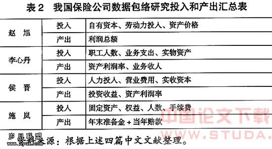 我国学者应用DEA评估方法研究保险公司也有过一些探索,但也存在一些问题,其中比较大的分歧集中在对保险公司投入和产出指标的选取上。现有文献大致从两个角度来研究保险公司的投入和产出。赵旭(2003)和李心丹等(2003)虽然都没有区分产、寿险,但他们最大的不同在于对保险公司产出的理解是单产出的还是多产出的。[16-17]侯晋等(2004)和施岚(2005)采用数据包络方法与回归方法相结合的思路,对我国财险公司进行了研究。[18-19]现将上述四篇中文文献的投入和产出指标概括在表2中。此外,还有些研究将数据包络方法作为工具,以研究保险企业的竞争力与规模效率的关系,如李陈华、张伟(2005)使用数据包络方法研究了规模不经济情况在中国保险业更具有一般性,但在一定程度上会受到其他因素的影响。[20]