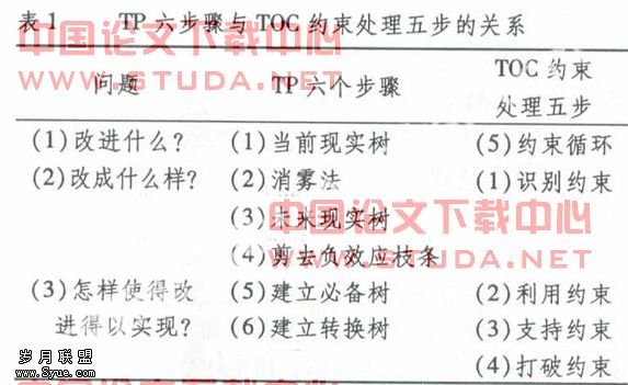 3.思维过程步骤与TOC约束处理步骤的关系。TP六个步骤既是约束处理的过程,也是对约束处理核心步骤的补充和细化,其目的都是为了解决前面提出的3个问题,如表1所示。??