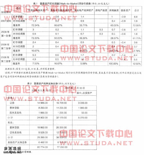 雷曼的住房、商业地产抵押相关资产中,即包括CDO资产。根据香港大学财务系副教授汤永军的数据,雷曼所做的CDO宗数在华尔街所有投行中排名第五,仅列摩根士丹利、摩根大通、美林和花旗之后,而独立学家谢国忠则估计雷曼的CDO资产至少超过500亿美元。根据雷曼财报,在2008年2月29日,雷曼拥有的CDO权益为62.68亿美元,以当期杠杆31.65,其CDO资产近2000亿美元,即使以其去杠杆化后的杠杆24.3保守计算,其CDO资产也高达1 500亿美元。若以美林处置其306亿美元CDO资产时的价格(出售价格67亿美元,仅为账面价值的21.9%)计算,这部分资产将面临巨额减值(美林处置CDO资产拉低了市场价格,根据mark to market的方法,这将直接导致CDO资产的盯市调整市场价格),这可以从表1中得到印证。