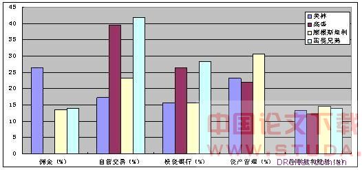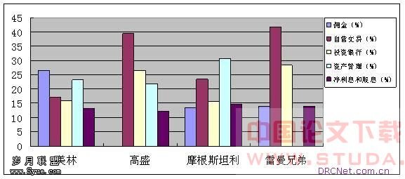 各大投资银行在保持业务收入多元化的同时,坚持“有面有点”的原则,通过扩大优势领域的市场占有率,提高利润,实行差异化经营。如下图所示(见图3),高盛和雷曼兄弟在投资银行和自营交易上有优势,摩根斯坦利在资产管理方面有优势,美林则在综合经营上以经纪和资产管理业务见长。