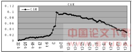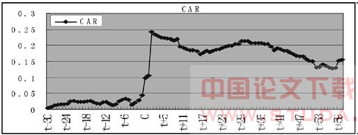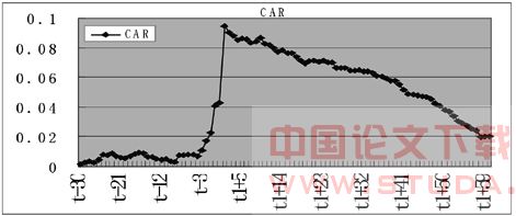 3、实证结果的检验。可以通过事件期内样本中所有股票的累计平均超额收益率CARt曲线随时间t的变化,来反映股票价格对事件的反应。