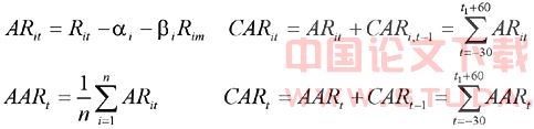 利用最小二乘估计法对上式进行回归,用参数估计期数据估计出αi和βi,并假定在事件期里,αi和βi保持不变,这样,我们可以得到事件期的超额收益率和累计超额收益率: