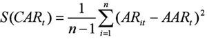 其中,ARit是计算出的事件期股票i在t时期的超额收益率,Rit为事件期股票i在t时期的实际收益,Rim为事件期t时期的天相流通指数(市场收益率),αi和βi为市场模型估计出的参数值,CARit为事件期股票i在t时期累计超额收益率,AARt为事件期t时期内的平均超额收益率,CARt为事件期t时期内的累计平均超额收益率。