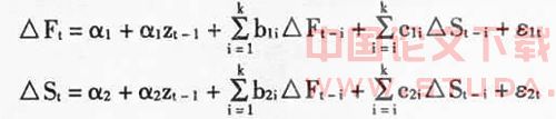 Engle和Granger证明了如果两个时间序列是协整的,那么一定存在一个误差修正表达式;如果存在一个误差修正表达式,那么这两个时间序列是协整的。Ghosh(1993)根据Granger和Engle的协整提出了双变量误差修正EGRCH模型,这种模型被认为最适合分析现货市场与期货市场关系。Ramaprassad Bhar的模型如下:
