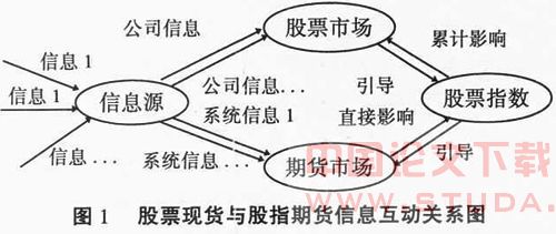 股指期货和现货市场之间的关系是相辅相成的,并非竞争的。股票指数期货是股票的衍生物,反过来说,股票指数期货是以股票为原生物的,而股票市场整体状况是以股票来刻画的,因而更直接地说,股票指数期货以股票指数为原生物。例如,投机资本通常在货币和资本市场、现货和期货市场联手操作,投机者在期货市场构筑空方头寸,在现货市场带头抛售股票,打压股价,通过传媒制造恐慌气氛,引起抛售瀑布,导致股价狂泻,从而在期货市场谋取暴利。图1为股票现货市场与股指期货市场的信息互动关系。