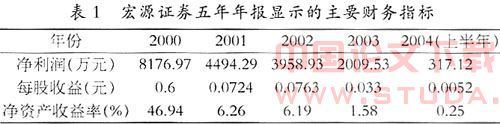(1)宏源证券。2004年的半年报显示,在宏源证券的收入构成中,手续费收入是其重要的利润支柱。公司手续费收入为9855.8万元,占营业收入的62.90%。因交易量增加及新增营业部等原因,2004年1-6月公司手续费收入较2003年1-6月增加了4522.95万元,增幅为84.81%。在营业收入增加的同时,支出也在增加。2004年上半年公司营业支出16932万元,同比增加了2004万元,增长幅度为13.42%。同时,因归还卖出回购款导致经营活动产生的现金流量出现负增长2177万元,归还借款本金及利息,导致筹资活动现金流量负增长6756万元,公司上半年现金及现金等价物呈现负增长7958万元。此外,2004年上半年,宏源证券自营证券差价收入为负2049.61万元。可以说,在其绩优背后隐藏着一定风险。并且,从宏源证券2000年以后5年年报显示的净利润、每股收益及净资产收益率这三项主要盈利指标逐年下降(见表1)也可以看出这一点。