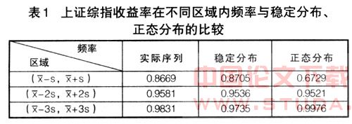 比较表1结果与上面结论,可以看出:在样本均值的3倍样本标准差内稳定分布都可以很好地拟合收益率的分布特点,但是正态分布则不然。对深证作同样分析,可得出类似结论。