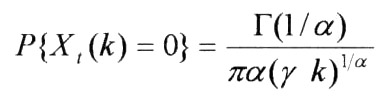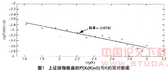 的频率,其中,x是根据收益率观察值的大小范围选定的一个适当小的数字。首先选择K值的恰当范围,选定适当小的x,以 的频率作为P{ Xt(K)=0}的估计,作P{ Xt(K)=0}与K的对数回归,根据回归的斜率估计稳定分布的特征指数α。