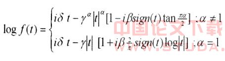 其中,α是特征指数,既度量分布的尖峰程度又度量分布的胖尾程度,α∈(0,2];β是偏斜度参数,β∈[-1,1],当β=0时,分布是对称的;β>0时,分布是右胖尾的,随β逐步逼近1,右偏斜程度增加,当β<0时,情形正好相反;δ是均值的位置参数,δ∈(-∞,∞);г是可以调整的标度参数,г∈(0,∞)。Sign(•)为符号函数。