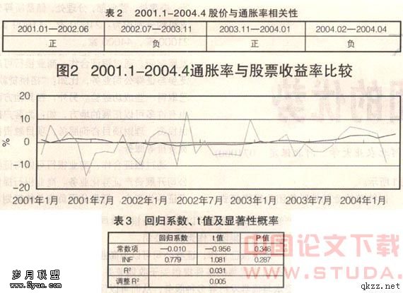 结果表明:2001年1月-2004年4月期间股票市场收益率与通货膨胀率呈正相关关系,一定程度上反映了宏观经济变量的变化,但统计意义上不具有显著性。