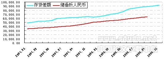 1、总体流动性过剩。在宏观调控及巨额顺差的双重夹击下,“流动性过剩”成为了2005年银行业全年的关键字。截至11月底,整个银行业累计发放贷款16,053亿元,但存款新增高达44,979亿元,新增贷存比不足40%;存贷差达92,078亿元,存贷差新增28,926亿元,创新高。与此同时,外汇储备不断增长,截至11月末,新增折人民币达到15,251亿元,因结汇而注入银行体系的流动性占到存贷差总额的53%。(具体见下图)