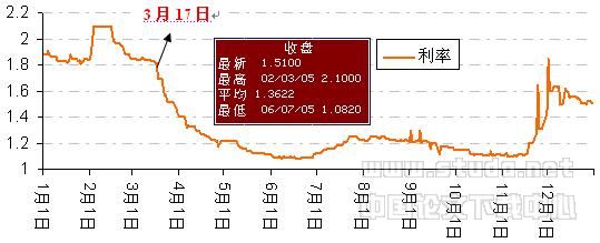 2、较低的市场利率。在银行体系流动性过剩情况下,人民银行在2005年3月17日将超额备付金利率由1.62%调整为0.99%,使市场利率一路下跌。下图为7天回购利率在2005年的走势,图中显示,3月17日人民银行下调利率后,市场利率迅速下跌。这说明超额备付金利率对货币市场利率具有强有力的支撑作用。
