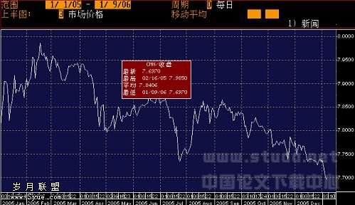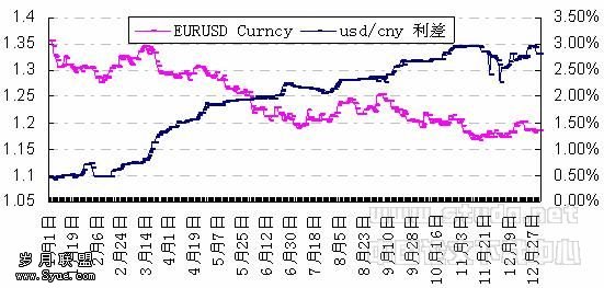2005年,美元不断升息,但人民币市场利率却一路下跌,美元/人民币的利差也由年初的0.46%扩大到了2.81%;同时,美元意外雄起,兑其它货币的汇率高歌猛进,以欧元为例,美元兑欧元汇率1年之内竟升值了12.6%(详见下图);另外,国际油价和金属价格也出现了大幅度上涨。上述这些因素,一方面拉升了游资的机会成本,另一方面,有效地转移了游资的投机重点,从而为人民币汇率改革创造了相当不错的国际国内环境。