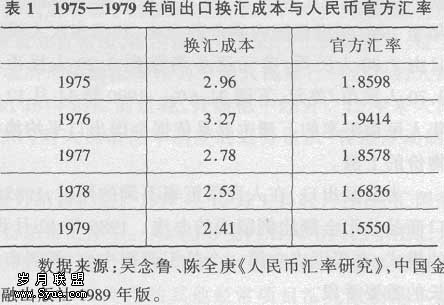 20世纪70年代后期,人民币汇率出现严重高估,长期以来的贸易与非贸易单一汇率制度已无法适应进出口贸易的要求,特别是对扩大出口不利。表1为1975—1979年间我国平均出口换汇成本与人民币官方汇率。如1979年我国出口1美元的商品,全国平均换汇成本为2.41元,而出口按银行牌价只能得到1.555 0元人民币,因此每出口1美元,企业要亏损0.855 5元,从而造成出口越多亏损越大,而经营进口反而赚钱的不合理现象。