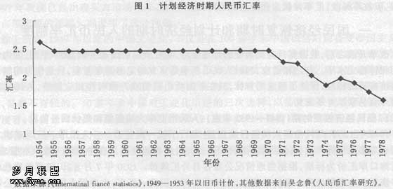自1953年起,我国进入社会主义建设时期,国民经济实行高度集中的计划管理体制,国内金融物价保持基本稳定。世界经济中以美元为中心的国际货币体系在20世纪70年代之前基本能发挥作用,维持纸币流通下的固定汇率制度。鉴于对私营进出口商的社会主义改造完成,对外贸易由外贸部所属的外贸专业公司按照国家规定的计划统一经营,外贸系统采取了进出统算,以进贴出的办法。1964年起还采取了对一部分进口商品加成的办法,即外贸为用货部门的进口商品作价,按进口成本加价103%,以进口盈利弥补出口亏损,不需要再用汇率来调节进出口贸易。在这种条件下,人民币汇率主要用于非贸易外汇兑换的结算上,按国内外消费物价对比,汇率已适当照顾侨汇和其他非贸易外收入,也无调整必要。为了维护人民币的稳定,有利于内部核算和编制计划,人民币汇率坚持稳定的方针,在原定汇价的基础上,参照各国政府公布的汇率制定,只有在外国货币发生升值或贬值时,才作相应的调整。l955年3月,新币代替旧币,直到1971年11月,人民币汇率在近16年时间里基本保持为2.4618人民币/美元的水平(如图1)。