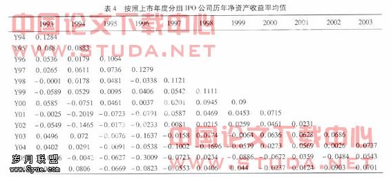 判断公司是否过度融资可从以下两个方面来考察:第一,公司进行融资后,是否能提升公司经营业绩,有没有给股东带来合理的回报?由于上市公司一般不向社会公众披露其债务融资及其使用情况,我们很难获得债务融资资金及其使用情况的相关数据。但是,可以通过分析上市公司自从首次发行上市(IPO)以后历年来经营业绩变化趋势来大致考察其融资效率。本文采用代表单位净资产盈利能力的净资产收益率指标,按上市年度分组来考察各组公司上市以后单位净资产盈利能力。由于1993年以前上市的公司只有53家,样本数量较少,加上一些数据不全,因此本文选取1993年以后上市的公司为样本,所有数据来自CSMAR数据库。结果如表4。