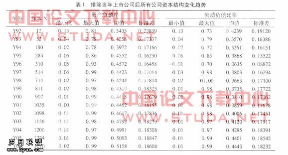 从表1中可以看出,在1992—2000年期间,排除当年上市公司对资本结构的影响,中国上市公司资产负债率经历了一个先降后升的过程,特别是2000年以后,上市公司平均资产负债率表现出明显的上升趋势。这显然难以用股权融资偏好来解释。再看表1中流动负债比率,其变化趋势与总资产负债率基本保持一致且数值相当接近,这暗示,中国上市公司负债融资中相当大比例来自短期负债,这与我们观察到的现实情况是吻合的,现实中大部分上市公司通常利用不断的短期借贷或债务展期来取得长期借贷的效果。
