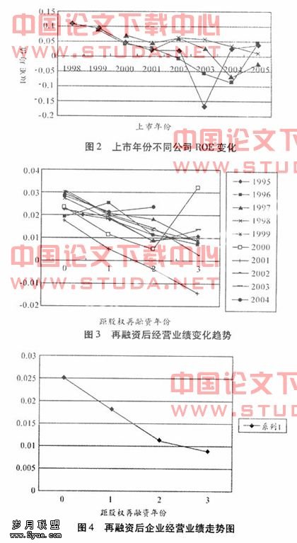 如果说中国上市公司自从首次发行(IPO)后,经营业绩持续下降。那么中国上市公司再融资后的经营业绩又有着怎样的表现呢?为此,本文以1995—2004年股权再融资的中国上市公司为样本,将样本公司按股权再融资年度分组,考察其在再融资后3年的经营业绩,结果如图3。