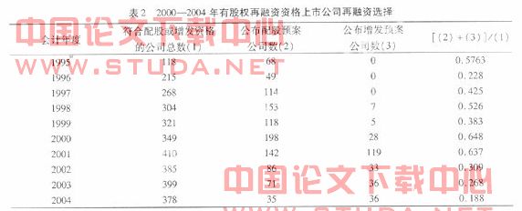 表2显示:1995—2004年期间具有配股或增发资格的上市公司中,有相当一部分公司虽然具有股权再融资资格却并没有选择股权再融资。尽管在2000年和2001年选择股权再融资的公司所占比例较大,但还是有超过1/3的上市公司自动放弃了股权再融资,2002年以后,绝大部分具有股权再融资资格的上市公司都自动放弃了股权再融资,这种现象显然与股权融资偏好的观点相违背。