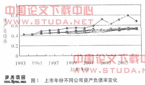 为了进一步考察中国上市公司融资方式选择是否具有股权偏好,本文还从CSMAR数据库中选取1992—2006年期间所有非金融类上市公司为样本,按照公司上市年度将样本公司分组,计算上市年份不同的上市公司资产负债率变化趋势,如图1。