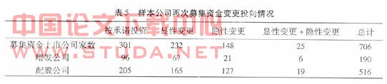 判断公司是否过度融资的第二个方面是:融资金额有没有用在企业的主营业务上,是否按照招(配)股说明书的有关承诺如期足额投入到预期的项目,也就是在企业进行融资后是否随意改变募集资金用途,造成募集资金浪费或闲置。为此,本文参照刘少波等(2004)的做法,将募集资金投向变更分为两种类型:显性变更和隐性变更。本文调查1995—2004年中国上市公司股权再融资公司变更募集资金投向,结果如表5。其中上市公司募集资金情况数据来源于CSMAR数据库,上市公司变更募集资金资料是根据上市公司相关年度报告和上市公司发行主承销商按照中国证监会有关规定在媒体上公开披露的回访报告等公开数据整理而成的。