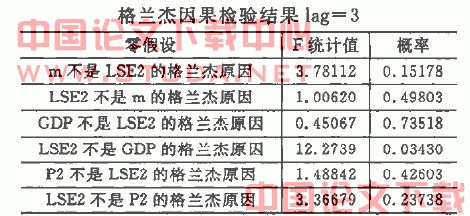 从表中可以看出,在5%的显著性水平下,只拒绝“LSE2不是GDP的格兰杰原因”的零假设,实际汇率是经济增长的格兰杰原因,反之不成立。可见,从1990年以来,我国实际汇率LSE2与经济增长GDP之间存在一种单向的因果关系。?