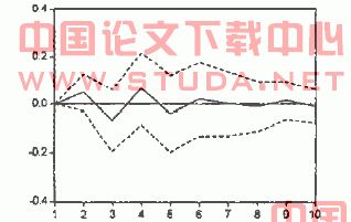 下图给出了变量间冲击的影响。横轴代表追溯期数,这里为10;纵轴表示因变量对个变量的响应大小,实线表示响应函数曲线,两条虚线代表两倍标准差的置信带。?