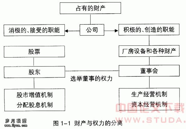 图1-1描述了现代公司制度中财产与权力的分离。财产与权力分离的结果,是股东作为公司的所有者可以任意处置其拥有的公司股票,但无权处置公司的资产。公司作为一个在形式上不依赖其所有者而独立存在的法人,可像一个所有者那样占有支配和使用公司资产,享受资产权利,承担民事义务,与其他法人或人发生各种关系。