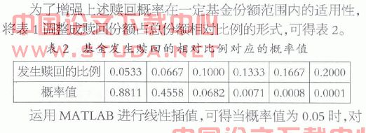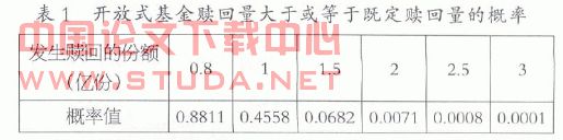 对于中国的开放式基金,赎回数据由每个季度的季报发布,数据发布的频率较低,而且中国的开放式基金成立后所运行的时间都比较短,缺乏足够的样本数据来准确估计和度量开放式基金赎回量与各主要影响开放式基金赎回的因素之间的关系,从而也难以估计出开放式基金赎回量在一定置信度下可能达到的最大值。本文基于程巍的结果,对于假定的一个总量为15亿份的开放式基金,根据模拟数据计算出了开放式基金赎回量大于或等于既定赎回量的概率,如表1。