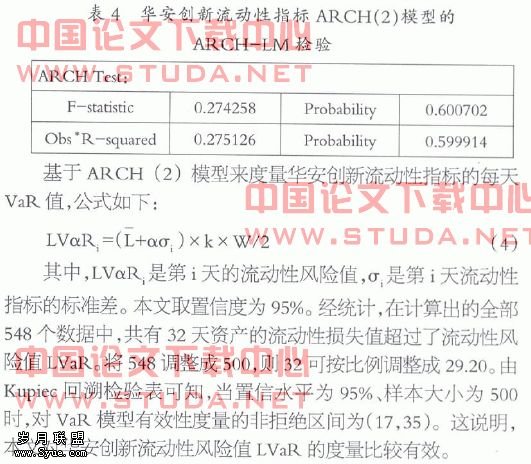 同样使用Eviews软件对ARCH(2)模型得到的流动性指标波动率进行ARCH效应检验,结果如表4,可以看出F统计量和TR2统计量均有较大的P值,说明异方差性已经消失。检验也说明使用ARCH(2)模型能够有效解决华安创新流动性指标的异方差问题,有助于更准确地估计出流动性风险的VaR值。