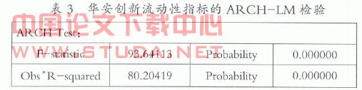 流动性风险与市场风险有着密切的关系,由于市场风险度量中的收益率存在明显的异方差性,进而流动性指标也很可能受异方差的影响。使用Eviews软件进行流动性指标的ARCH检验,如表3。