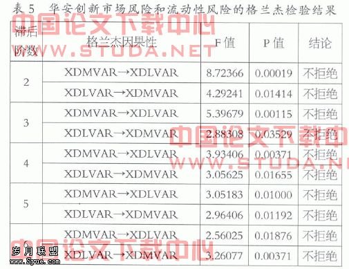 格兰杰因果检验可用来检测两个变量之间是否存在格兰杰因果关系。如果两个变量之间存在明显的格兰杰因果关系,则一个变量的变化与另一个变量的变化之间互为因果,会进一步加大变量的变化程度,而正反馈效应反映的正是两个变量之间的互相强化现象,因此,本文选用格兰杰因果检验来对变量之间的正反馈效应进行检验。选取的两个变量分别是华安创新的相对市场风险值XDMVAR和相对流动性风险值XDLVAR,相对风险值即是用百分率表示的风险值,格兰杰因果检验的滞后阶数分别选取2、3、4、5、6,检验结果如表5。