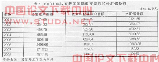 其次,经济发展的内外不均衡还体现在国际收支的长期失衡上。长期以来,我国大力发展劳动密集型产业,服装加、装配等行业的发展以及国外消费对出口的拉动,使我国保持着对发达国家特别是美国的贸易顺差。2001 年以来,我国经常账户和资本与金融账户的顺差逐渐扩大, 外汇储备急剧增加(见表1),并于2007年初超过日本成为全球最大的外汇储备国。截至2008年底,我国的外汇储备已增加到1.95万亿美元,同比增长27.34%。这是推动人民币升值的主要经济因素。