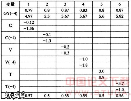 从图中可看出,实际GDP季度环比增长率GY主要受上年同期的实际GDP季度环比增长率GY(-4)影响,6个方程中GY(-4)系数都是显著的。我国股票市场发展状况的三个指标都不显著地进入增长回归模型中,不仅如此,这些指标的滞后变量也都不显著地进入增长回归模型中。这三个指标及各自的滞后变量在统计上都不显著,这告诉我们,我国股票市场发展对经济增长的作用极其有限。国外学者在股票市场发展和经济增长关系上的主流看法——股票市场发展和经济增长相互促进-是不适用于我国的。