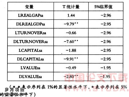 (1)变量平稳性检验。对变量进行协整分析之前,首先需要对变量的平稳性作检验,只有变量在同阶平稳的条件下,才能进行协整分析。为避免数据的剧烈波动,再对各序列进行对数化处理,新序列分别记为LREALGAPsa、LTURNOVERsa、LCAPITALsa、LVALUEsa。处理后的各数据序列单位根检验检验的结果如下。