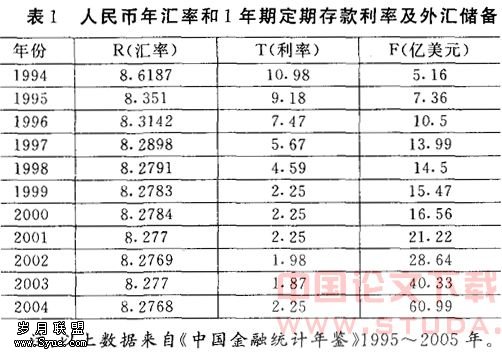 近几年来,我国实际采用的是盯住美元的汇率制度。因此,我们选取1994~2004年人民币对美元汇率的数据,利率指标选取的是1994~2004年间中国人民银行规定的1年期定期存款利率(见表1)。